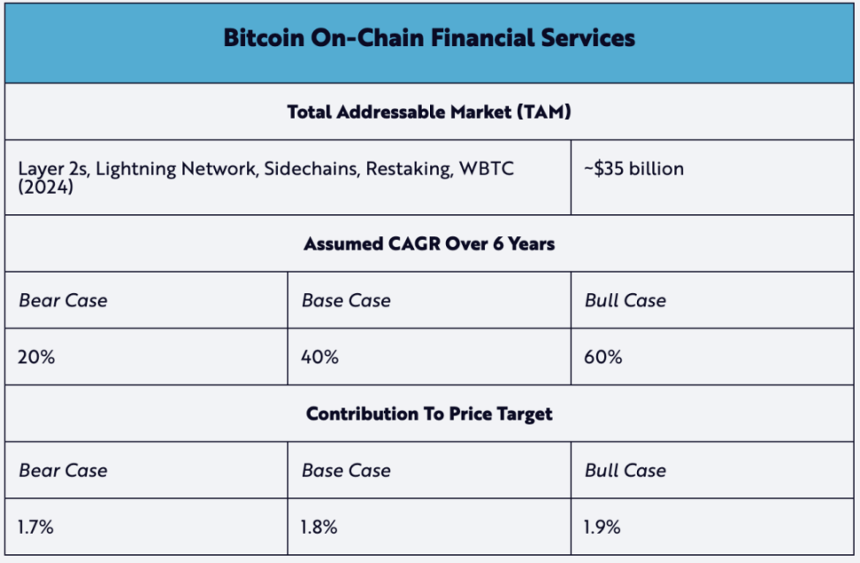 比特币的原生金融服务正在成为资本积累的新兴贡献者。其中突出的例子包括:像闪电网络这样的 Layer 2 服务致力于扩展比特币的交易容量,而以太坊网络上的 Wrapped BTC(WBTC)则使比特币能够参与去中心化金融。此类链上金融服务正成为比特币生态系统中日益重要的特征。因此,我们认为,从现在到 2030 年,基准市场 40% 复合年增长率是基于现实情况下的预期。