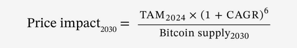 Odaily 星球日报注:该公式通过 2024 年比特币总价值与每年的复合增长率来计算 6 年后的比特币 TAM,并除以比特币 2030 年流通供应量来计算其价格。