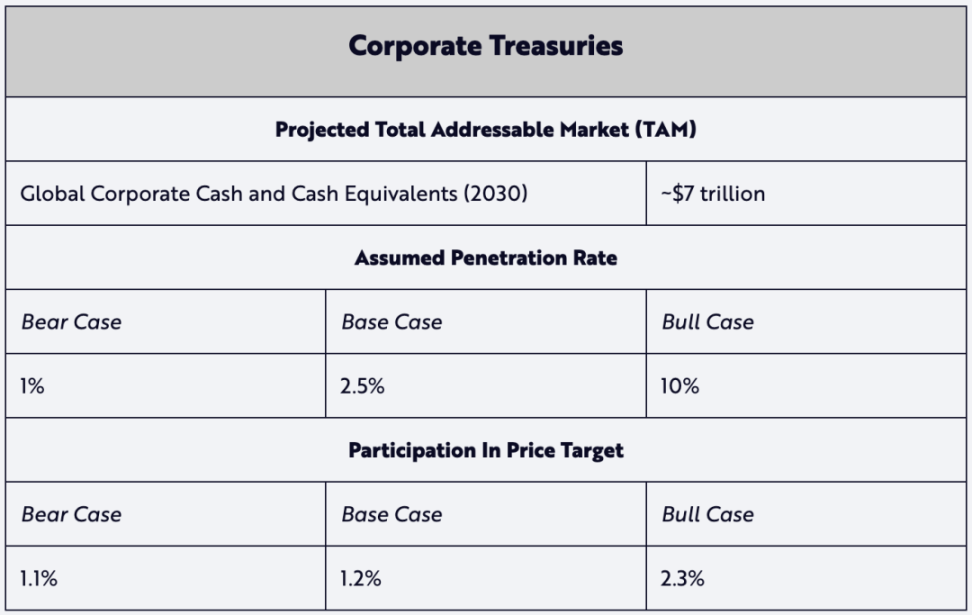 受 Strategy(微策略)公司自 2020 年以来成功购入比特币的启发,其他公司也纷纷将比特币纳入其企业财库储备。截至 2024 年底, 74 家上市公司的资产负债表上持有约 550 亿美元的比特币。如果这些企业 BTC 战略在未来六年内被证成功,那么我们在熊市和基准情景下的保守渗透率假设(分别为 1% 和 2.5% )最终可能会接近于牛市假设下的 10% 。