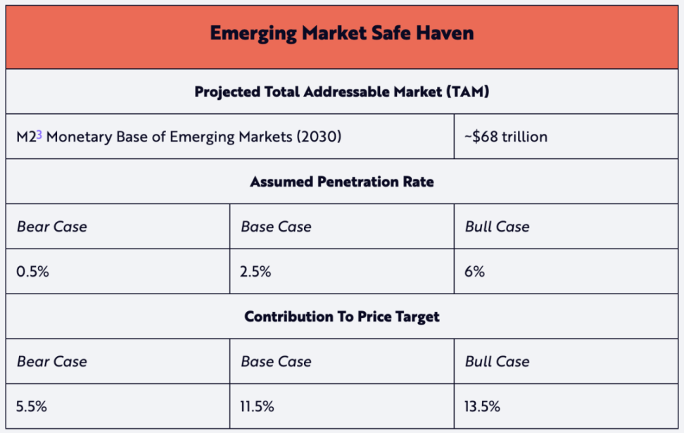 新兴市场避风港 TAM 基于所有发展中国家(根据 IMF/CIA 的定义,也称为“非发达”经济体)的货币基础。我们认为,比特币的这一用例具有最大的资本增值潜力。除了其价值存储特性外,比特币的低门槛还为拥有互联网的个人提供了一种投资选择,这种投资选择可能会随着时间的推移带来资本增值,与美元等防御性配置不同——从而保持购买力并避免本国货币贬值。