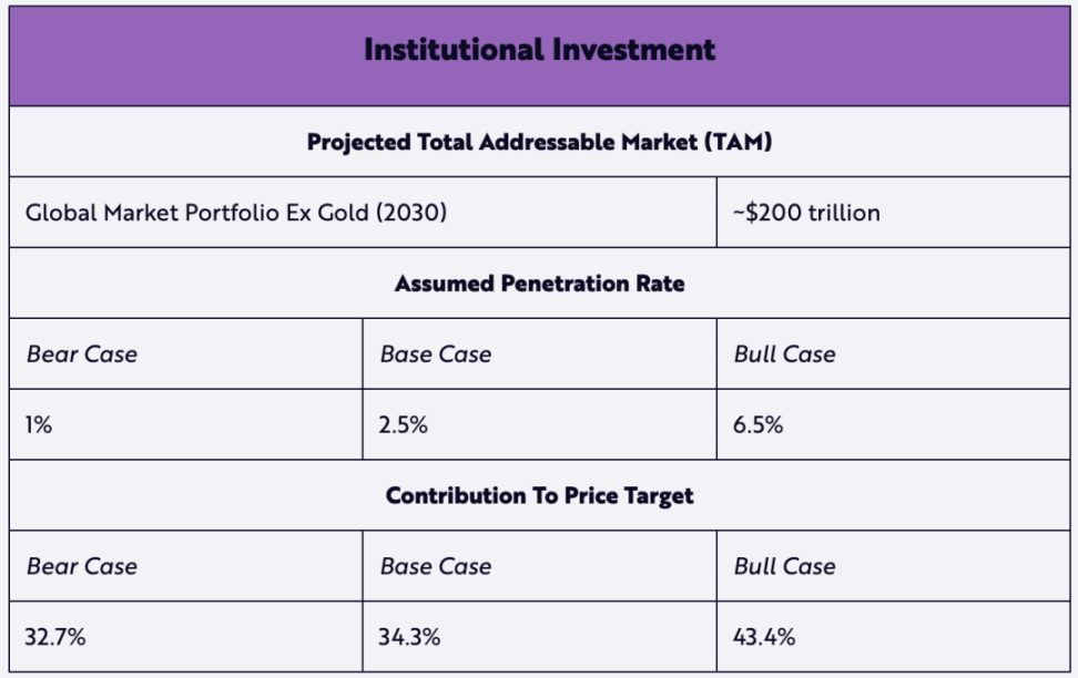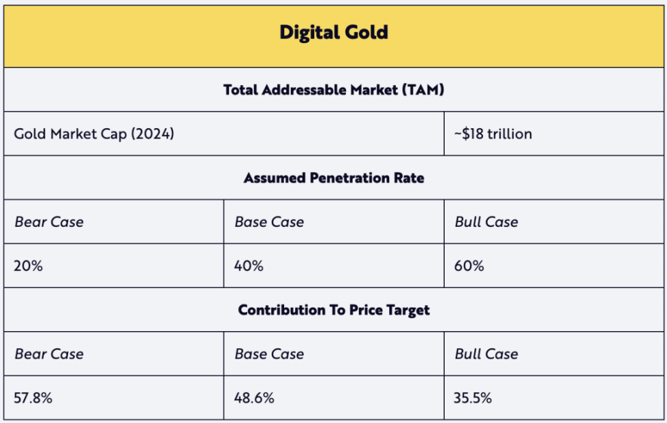 数字黄金的贡献假设了 TAM 相对于黄金当前市值的比率。鉴于给出的积极的渗透率,我们假设黄金在 2030 年的预期 TAM 不会增长,从而降低其预期值。我们认为,比特币作为数字黄金是一个有吸引力的叙事,这将推动其渗透率。