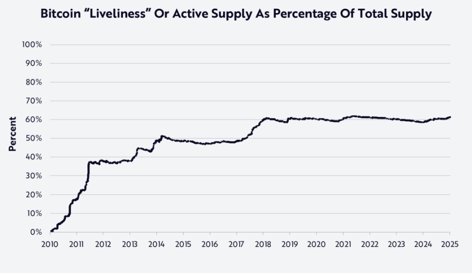 如图所示,自 2018 年初以来,比特币的网络活跃度一直保持在 60% 左右。我们认为,这种程度的活跃度表明约 40% 的供应量是“vaulted”(即存储不进入市场的比特币,比如中本聪的比特币地址)——我们在 ARK 白皮书《Cointime Economics:比特币链上分析的新框架》(https://www.ark-invest.com/white-papers/cointime-economics) 中深入探讨了这一概念。