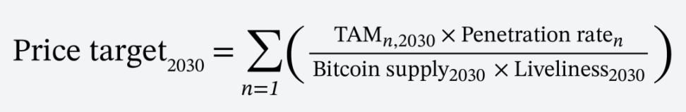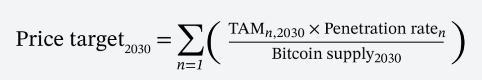 Odaily 星球日报注:该公式通过量化市场需求和比特币流通的动态关系来预测 2030 年比特币的价格。通过细分市场的最大美元基准需求规模与比特币在其市场的渗透率相乘并除以比特币的流通供应量得出比特币价格,并将所有细分市场(以下细分市场 / 概念)的价格求和得出比特币在 2030 年的预测价格。