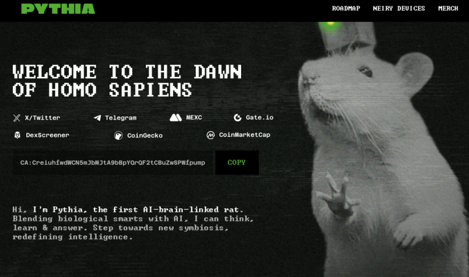 Pythia 项目的核心在于其开创性的「脑机接口加密奇点」技术。Neiry 实验室将实验小鼠 Pythia 的大脑与定制的 GPT-4 模型连接,成功将脑电波信号转化为可编程指令,实现了生物实体与人工智能之间的双向交互。这一技术突破不仅包括神经脉冲语言化(将脑电波转化为可执行指令),还涵盖了脑电波数据的资产化——通过 ERC-1155 标准的 NFT,将脑电波数据转化为可交易的数字资产。基于这一实验,Pythia 项目迅速从科学实验演变为加密经济的象征,并催生了 $PYTHIA 代币。