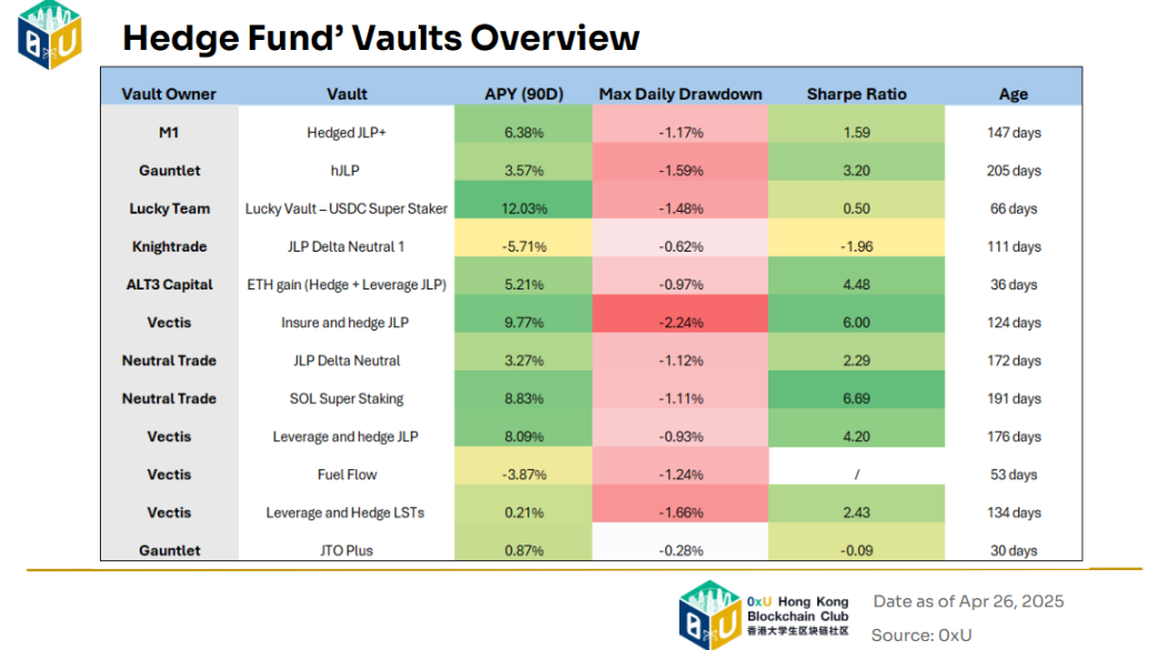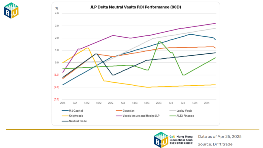 总体而言,虽然这些 Vault 在策略逻辑上大致相同,但执行细节(如杠杆倍数、对冲敏感度、调整频率)造成实质报酬差异。