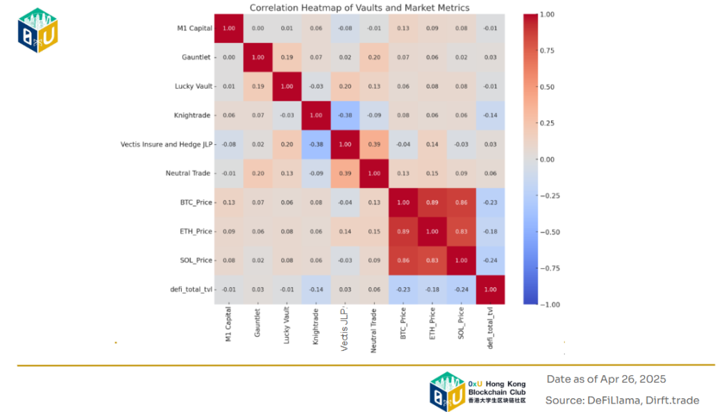 尽管这些 Vault 采用相同的市场中性策略架构,但从相关性热图中可观察到,它们之间的绩效表现并未高度同步,整体呈现低度相关。大多数 Vault 的彼此相关系数落在 -0.1 到 0.2 之间,显示在执行相同逻辑下,不同团队在操作策略时仍存在明显差异性。