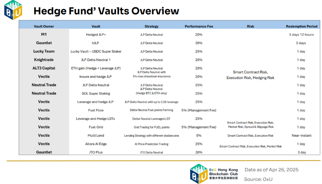 上图比较了不同协议的金库的策略,表现收费,风险和赎回时间。当前在表现费用方面,Knighttrade、ALT3 Capital 以及 Vectis 所采用的 JLP 市场中性策略皆维持在低水平(20%),在同类策略中具备明显成本优势。此外,这类策略普遍面临三大主要风险:智能合约风险、对冲风险与操作风险。