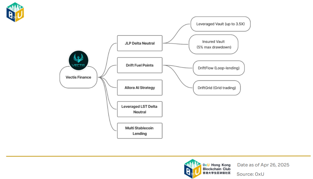 经过系统性的审计与实战演练,Drift Vaults 现已聚合超过 20 条策略,成为全链最大的结构化产品平台,并吸引了包括 Vectis、Gauntlet、Neutral Trade 等多个团队基于其上开发金库。Vectis 的多项核心产品,如 JLP Navigator、LST Compass 及 FuelFlow/FuelGrid,均直接调用 Drift Vaults 程序,因此其交易撮合与清算逻辑天然继承了 Drift 已通过验证的安全保障。