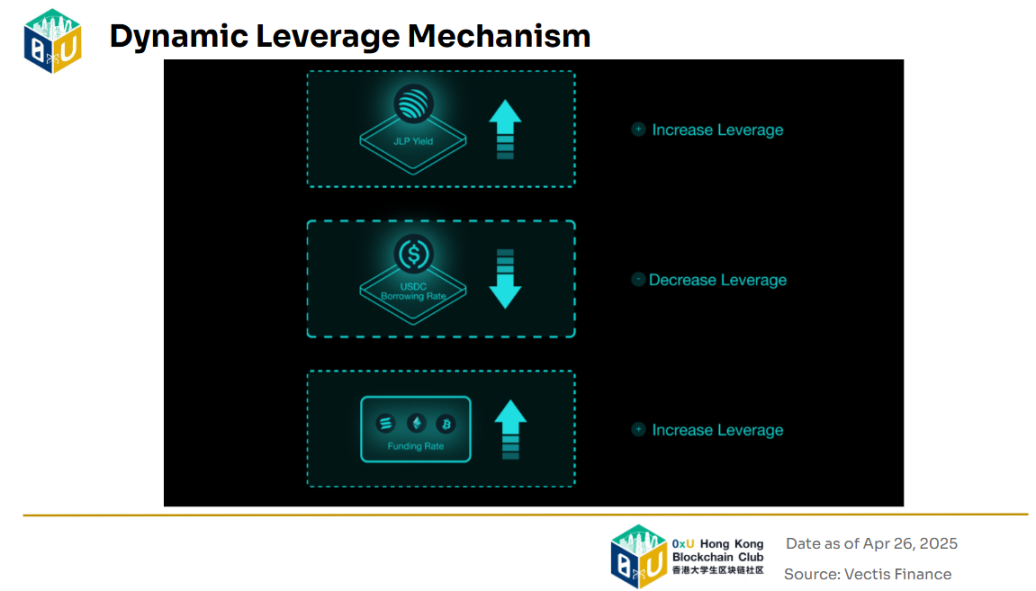 Dynamic Leverage Mechanism 指的是系统会持续监控 JLP 收益率、USDC 借贷成本及 SOL、BTC、ETH 的资金费率,并根据市场变化自动调整杠杆水平:当 JLP 收益率上升时提高杠杆;当 USDC 借贷成本上升时则降低杠杆;而资金费率及对冲需求上升时亦会适度提高杠杆。