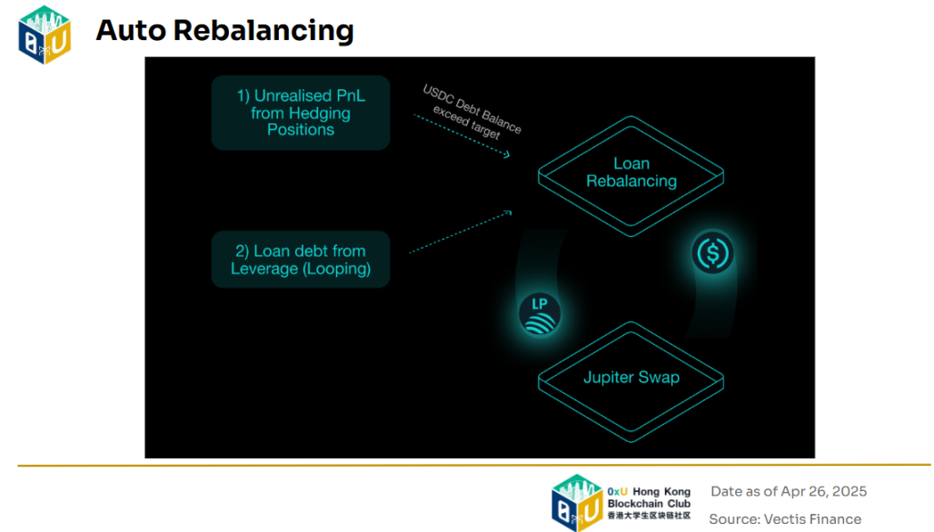 在此基础上,部分协议进一步引入了创新功能,例如 Vectis 推出的 JLP Navigator Vault 策略。该策略透过循环贷的方法允许最高达 3.5 倍杠杆,并搭载 Dynamic Leverage Mechanism 与 Auto Rebalancing 系统。