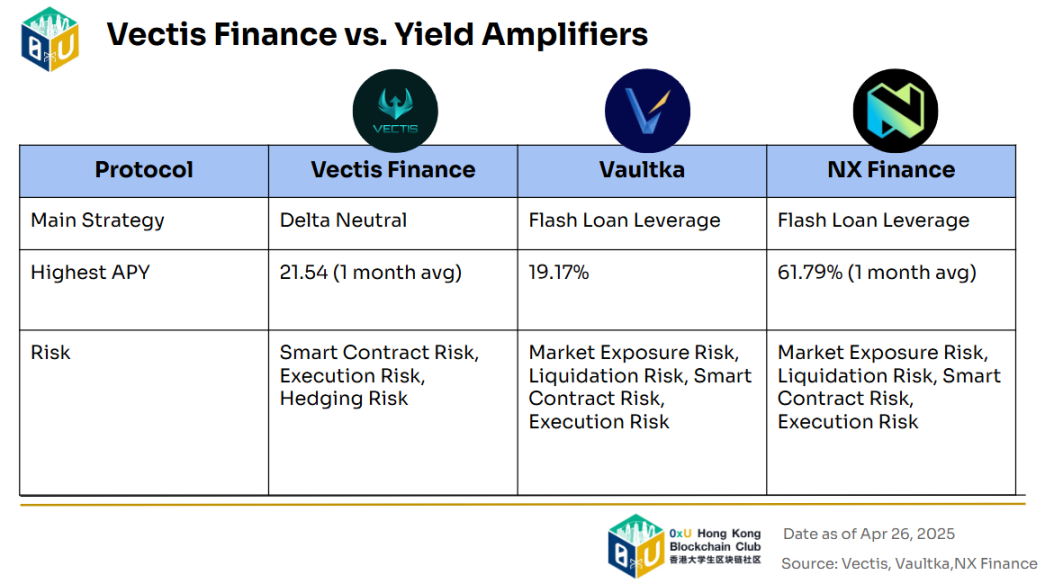 虽然基于 Solana 或 JLP 的收益来源种类繁多,但各类策略之间仍存在明显差异。上图对比了 Vectis Finance 与其他收益放大器项目的不同之处。可以看到,例如 Vaultka、NX Finance 等项目,并未采用市场中性策略,而是通过 Flash Loan 进行循环借贷,从而暴露在资产价格波动之中。因此,这类策略的收益不仅受市场波动影响,同时承担更高的资产价格风险。