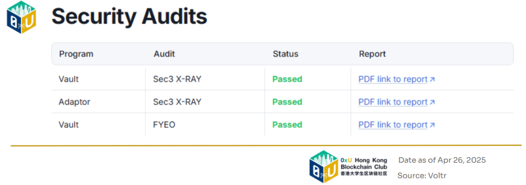 其次,Voltr 作为一个 AI 增强型的自动化做市商,在 2025 年初通过 FYEO 和 Sec3 X-Ray 完整安全审计,并设有长期开放的公共漏洞赏金池以持续提升安全性。Vectis 多数杠杆策略的流动性来源于 Voltr 的资金池,这不仅提供了额外的深度支持,也确保了其撮合与流动性管理经过了专业的风控验证。