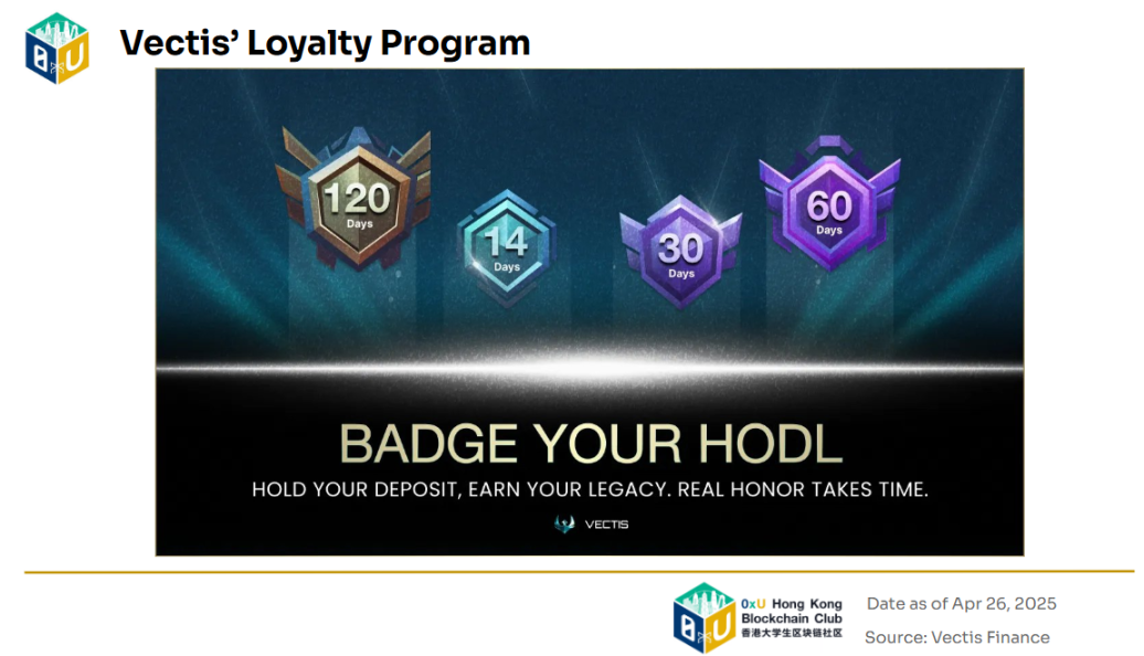 而 Vectis Finance 亦十分积极推动社群参与和推崇长期价值共创的理念,近期正式推出其用户忠诚计划 —「Badge Your HODL」徽章机制。此机制以持仓时间为核心指标,根据用户的资产持有时长授予不同等级的徽章,现阶段共设有超过七个徽章等级,并率先开放前四级供社群参与。