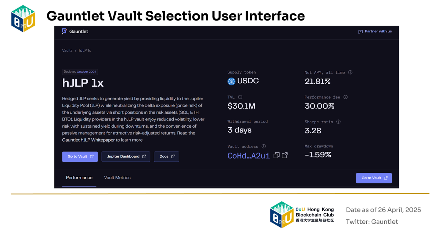 Gauntlet:需通过 Drift 官方应用访问其金库。Drift 的界面专业严谨,但对新手用户来说可能显得复杂,如永续合约、抵押逻辑等。Gauntlet 提供策略说明文档 “VaultBook”,有助于高阶用户理解策略逻辑。整体 UX 更偏向有经验的 DeFi 用户。