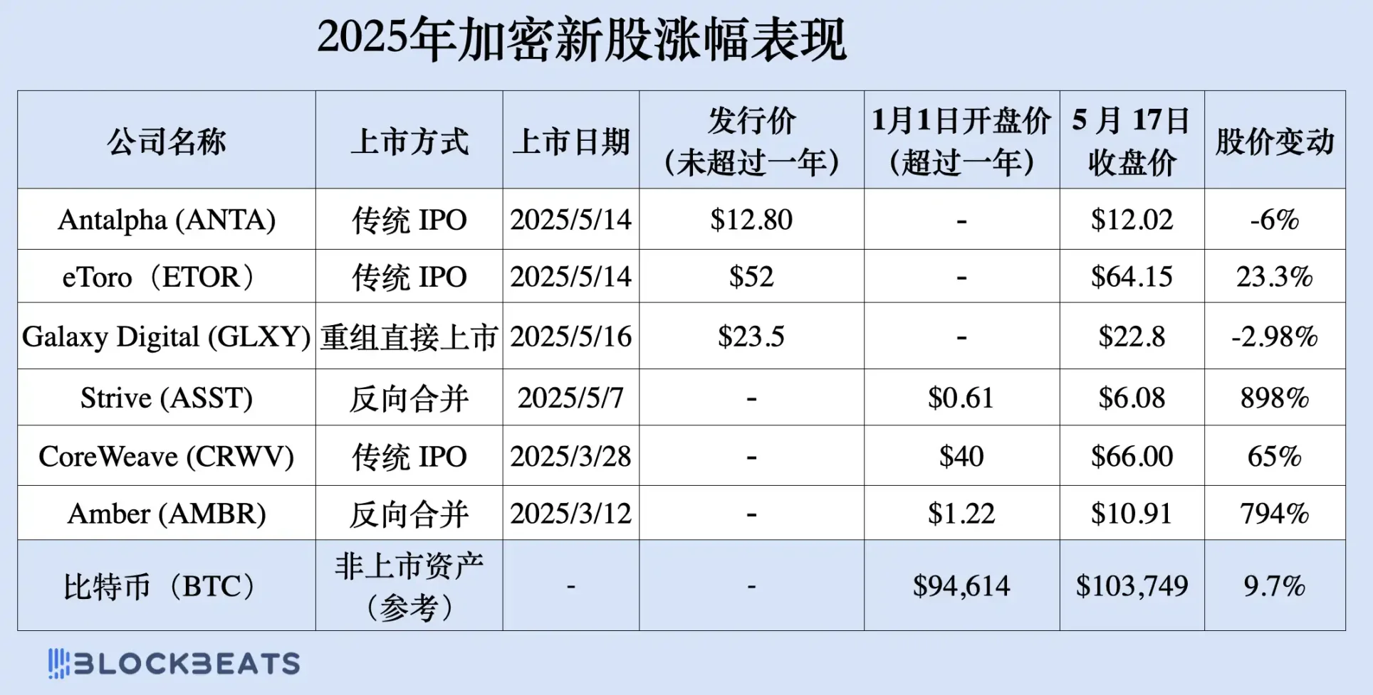 今年上市的加密美股涨幅,远远甩开了 90% 的山寨币和土狗币。