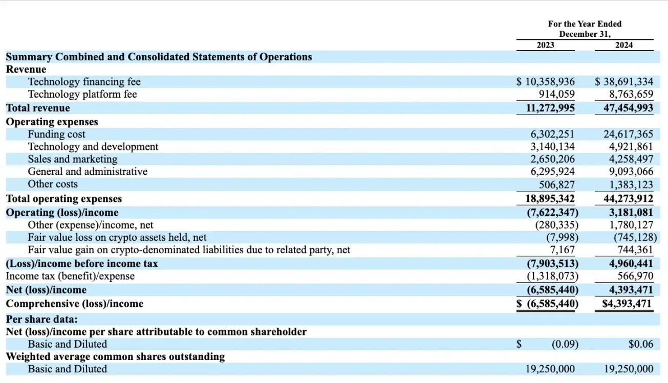 伴随收入规模的快速增长,公司的运营支出也显著提升。2024 年全年运营总成本达到 4,427 万美元,较 2023 年的 1,889 万美元增长约 135%。其中,融资成本从 630 万美元升至 2,462 万美元,与平台资产规模扩大高度匹配;技术研发支出达 492 万美元,同比增长 57%,显示出公司持续投入于技术栈建设;而市场营销与行政管理方面的支出合计约为 1,335 万美元,主要用于业务扩张、合规架构建设以及上市相关筹备。