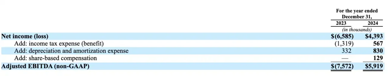 为了进一步体现运营效率与真实盈利能力,Antalpha 披露了非 GAAP 财务指标——调整后 EBITDA(Adjusted EBITDA)。在剔除所得税、折旧摊销及股权激励后,该项指标由 2023 年的 -757 万美元大幅改善为 2024 年的 +591 万美元,显示出公司核心经营模式在持续优化,已成功迈入盈利释放阶段。