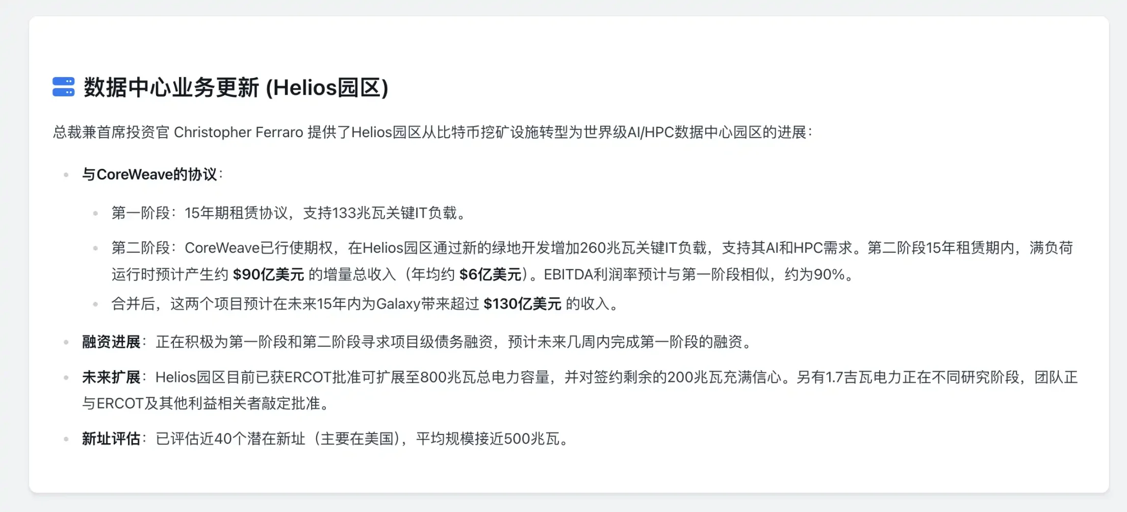 值得关注的是 Galaxy 正在构建的 AI 数据中心业务,即位于德州的 Helios 项目。本季度虽然尚未开始确认该部分营收,但其转型进程已进入关键阶段。项目前两期合计部署算力达 393 兆瓦,并已与 AI 基础设施龙头 CoreWeave 签订 15 年长期租赁协议。根据协议推算,该数据中心将在未来十五年内为 Galaxy 创造约 13 亿美元甚至更高的累计营收。目前这部分支出被视为资本化投资,不影响当期利润,但它显然是 Galaxy 下一阶段增长曲线的关键组成。