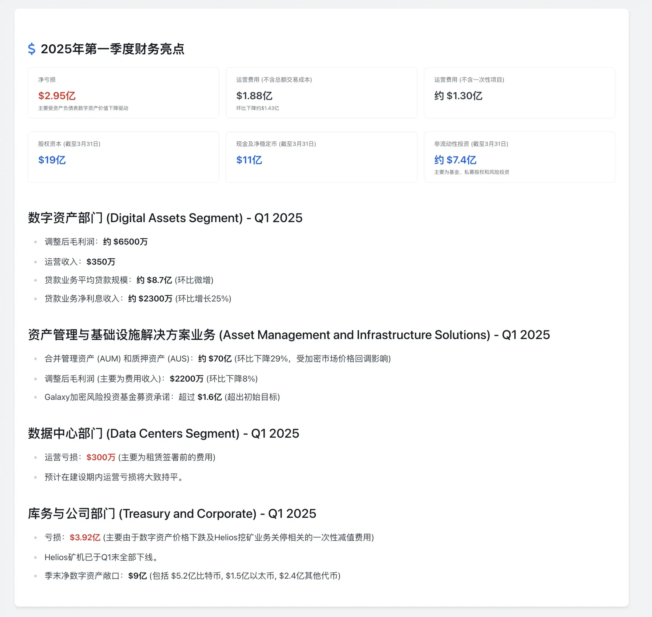 2025 年第一季度,Galaxy 的非 GAAP 经营收入合计达到 8,700 万美元,其中包括来自数字资产相关业务的 6,500 万美元和来自资产管理的 2,200 万美元。这部分收入主要来源于自营交易、Prime 经纪、结构化信贷、ETF 管理费与基金收入,构成了公司稳定且可持续的现金流来源,进一步显示出其「交易 - 资管 - 基础设施」三位一体的运营体系正在持续发挥作用。
