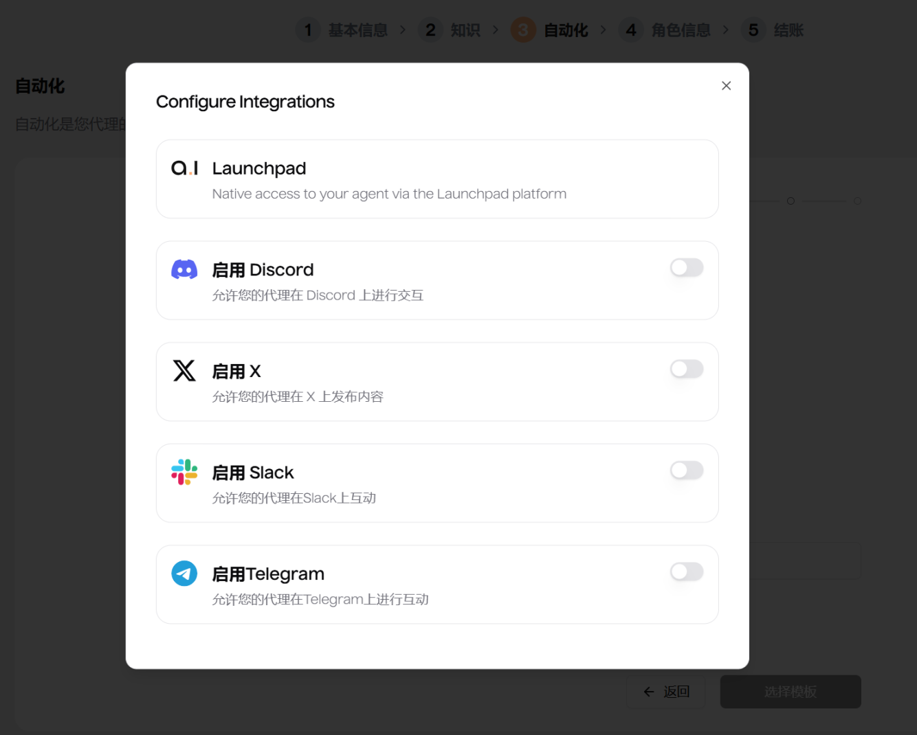 在自动化配置页面,您可以为智能代理人选择一个或多个发布渠道: