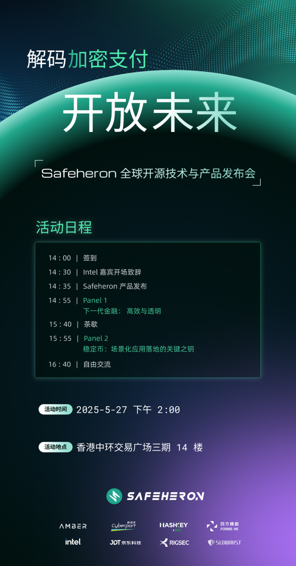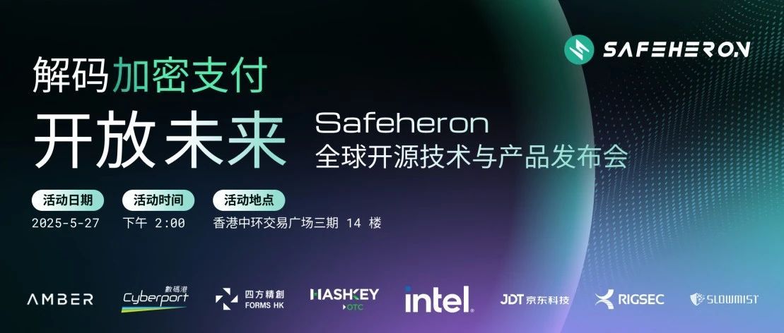 2025 年 5 月 27 日,Safeheron 将在中环交易广场举办主题为“解码加密支付的开放未来”的行业盛会,期间将重磅发布全球首个基于 C++ 的 Intel SGX TEE 原生开发框架、及 Safeheron 全新产品矩阵与行业级解决方案。