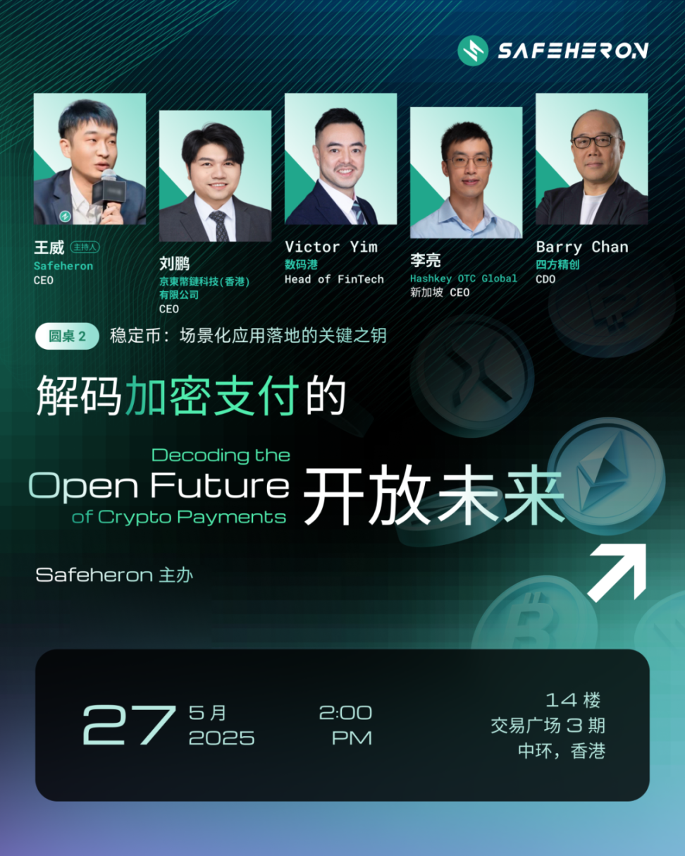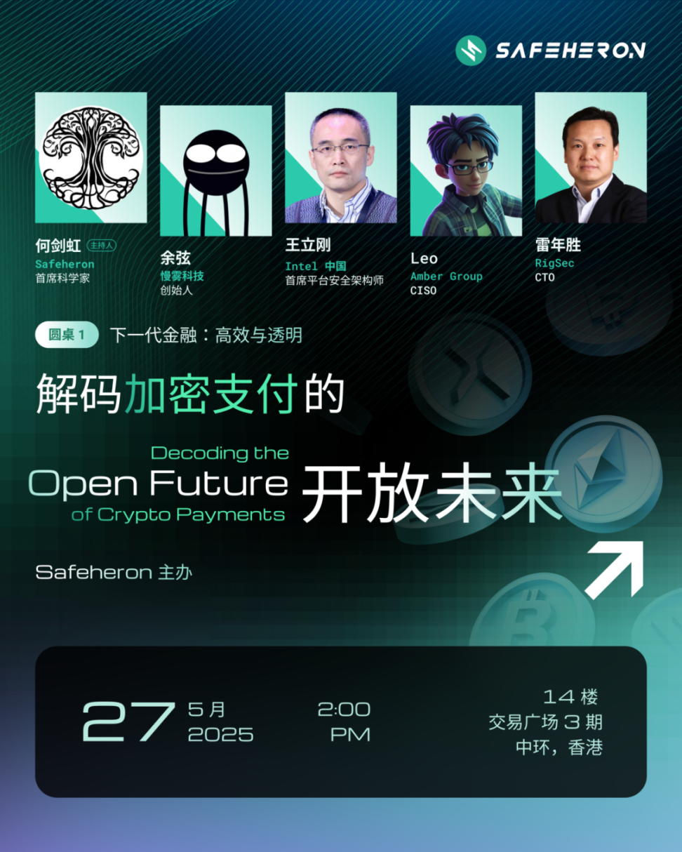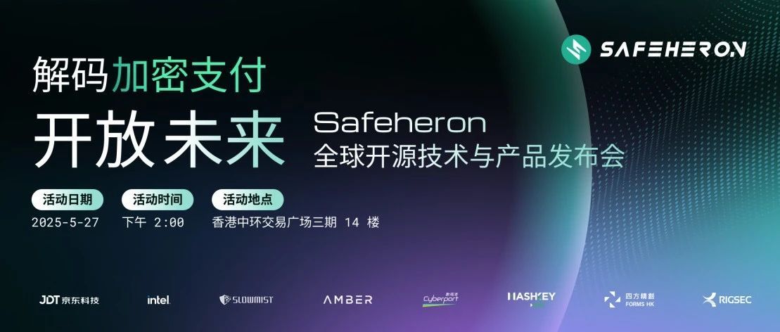 2025 年 5 月 27 日,Safeheron 将隆重举办备受期待的研讨会,主题为“解码加密支付的开放未来——Safeheron 全球开源技术与产品发布会”,地点设在香港中环交易广场。本次活动旨在探讨开源技术如何重塑区块链生态系统,展示其变革力量。作为区块链安全领域的先驱,Safeheron 将通过此次活动,全面展现开源技术在行业中的深远影响。