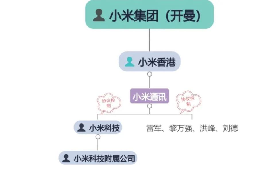 通过小米集团(开曼)控股小米香港公司再投资小米通讯等实体层。小米通讯与小米科技及其工商登记的股东签署协议控制法律文件,通过 VIE 协议控制小米科技并间接控制小米科技附属公司。