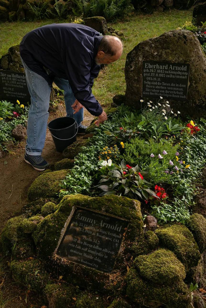 Hans Brinkmann tends the grave of Eberhard Arnold in the community burial ground near Sannerz, Germany.