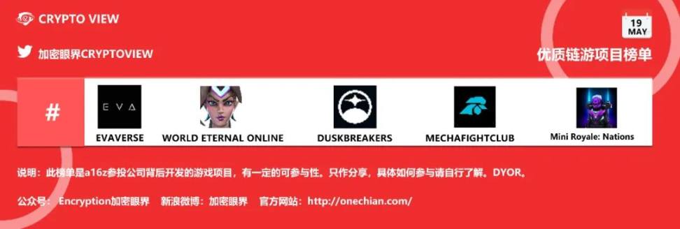 可以关注的几款游戏:Evaverse@Evaverse_NFT、World Eternal Online @WorldEternalMMO、MiniRoyale:Nations@MiniNations、MechaFightClub@mechafightclub