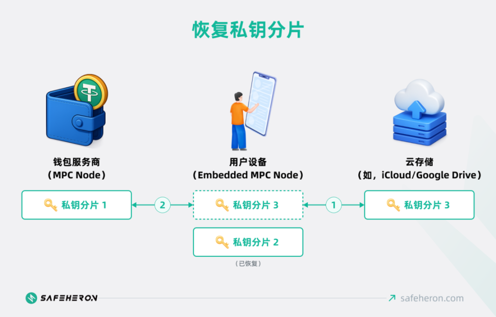 钱包服务商云端环境中的私钥分片 1 与用户设备上恢复出的私钥分片 3 协同执行 MPC 恢复协议,共同计算并生成新的私钥分片 2,将其安全写入用户设备中。为最大限度保障安全,私钥分片 3 在完成恢复任务后立即从设备中彻底删除,有效防止重复使用或潜在泄露风险。