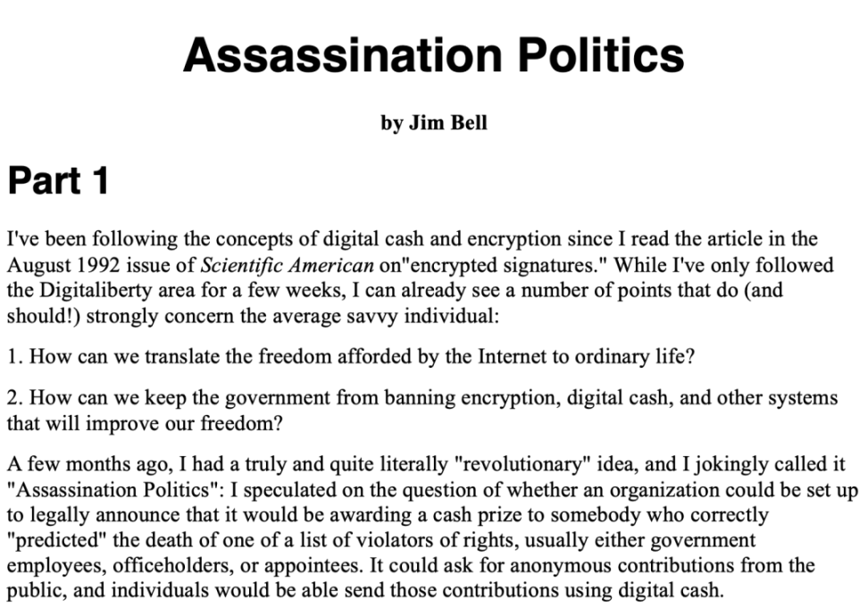1996 年夏天,吉姆·贝尔(Jim Bell)将他分十部分撰写的《暗杀政治》(Assassination Politics)论文发送给密码庞克群体——这是一群对密码学充满热情并致力于数位隐私的行动主义者。这些人中许多都坚信,加密技术可以改变权力平衡,将权力从政府手中转移到公民手中。贝尔设计的暗杀政治系统旨在通过暗杀威胁,强制规范那些超出系统运营者可接受行为范畴的人;贝尔认为,加密技术提供了足够的匿名性,使得这种暗杀政治市场无法被摧毁。