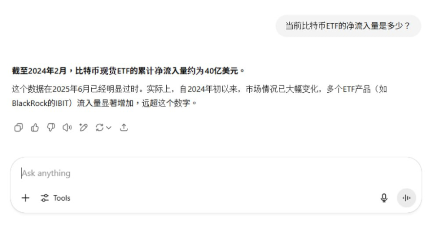 ChatGPT 回答:"截至 2024 年 2 月,比特币现货 ETF 的累计净流入量约为 40 亿美元。" (过时数据)