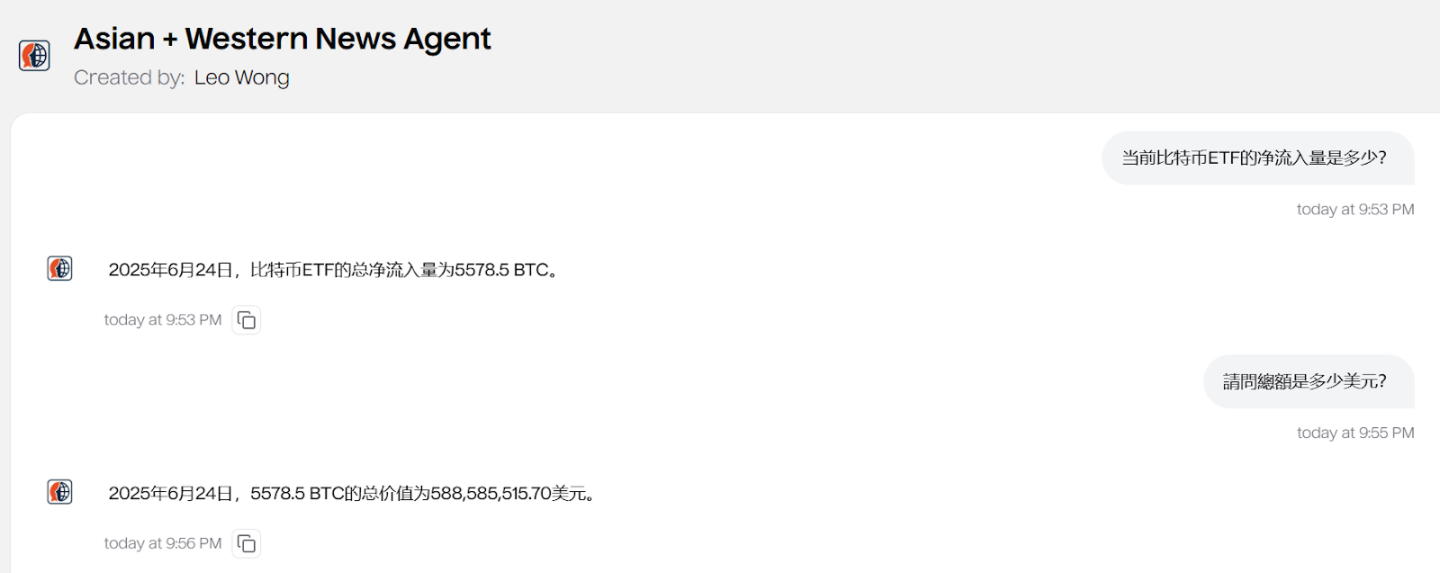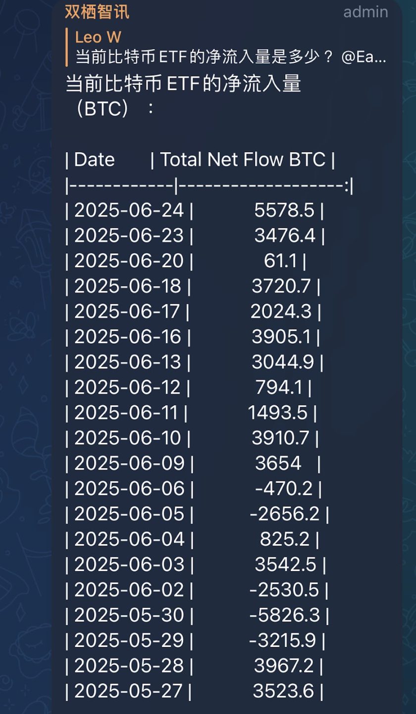 用户提问:"当前比特币 ETF 的净流入量是多少?"