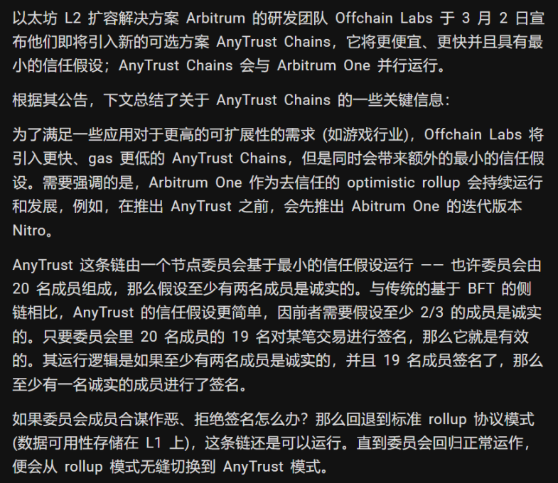 ➤ Arbitrum 推出基于 AnyTrust 技术的方案 Arbitrum Nova