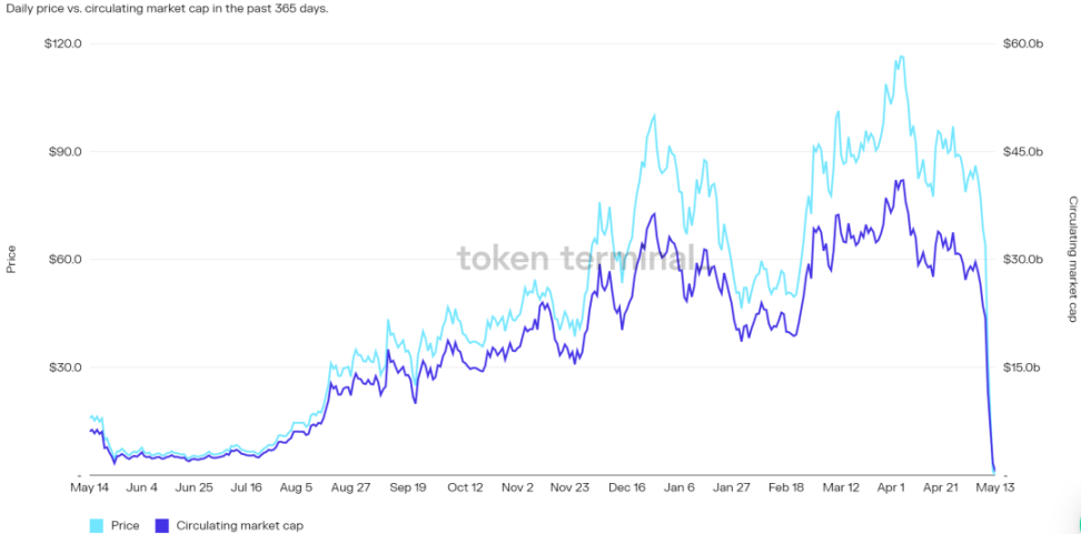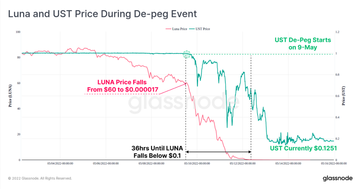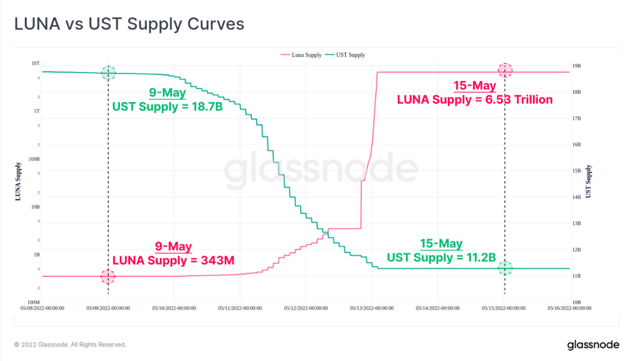 On May 9, Terra announced that it would use \(750 million of its bitcoin reserves to help stabilise UST, but the selling didn’t end. UST’s unanchor situation fell below \)0.98, and many users panicked. At that time, LUNA’s price was around \(60 (down 49.5% from its previous high of \)119). Over the next 36 hours, LUNA fell below \(0.10 and UST traded between the extremes of \)0.30 and \(0.82. This disabled the protocol redemption mechanism because all users are panicking and trading a UST for \)1 worth of LUNA, causing a supply explosion that drives down prices even further. On May 12th, Luna continued its plunge to almost zero and UST fell below $0.2.