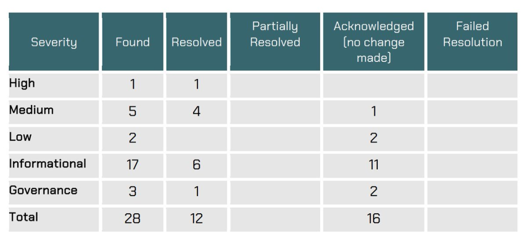 以下这个表格是 Sonic 生态某 Defi 应用的审计报告摘要。其中一共发现了 1 个高风险、5 个中度风险、2 个低风险、17 个信息性风险和 3 个治理问题。