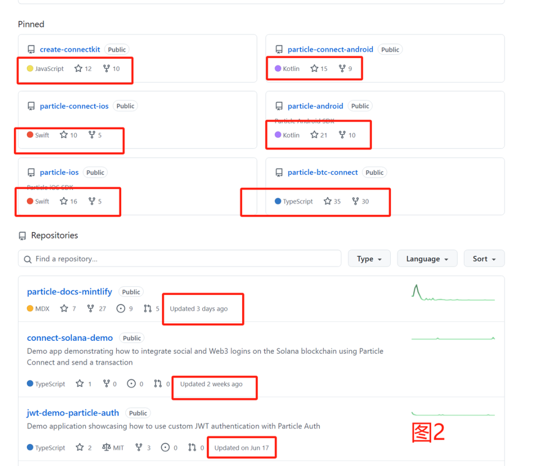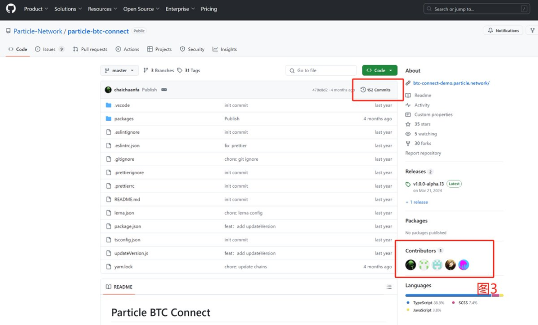 图 2 中置顶的几个库点进去看看,例如这个 Particle-btc-connet,看名字就知道是 particle 连接 BTC 生态的代码,共有 152 次代码提交。
