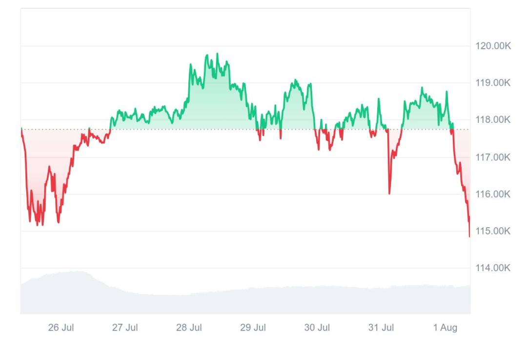 在 2025 年 7 月 26 日至 8 月 1 日期间,比特币具体走势如下: