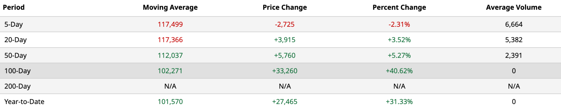 技术结论:MA 排列顺序(短线跌破,中线临界,长线仍多)暗示市场处于调整初期向中期演化的阶段。后续若跌破 MA50(112,037),将构成技术性破位,或引发更深层次的回撤,关注 110,000 与 105,000 区间支撑位。