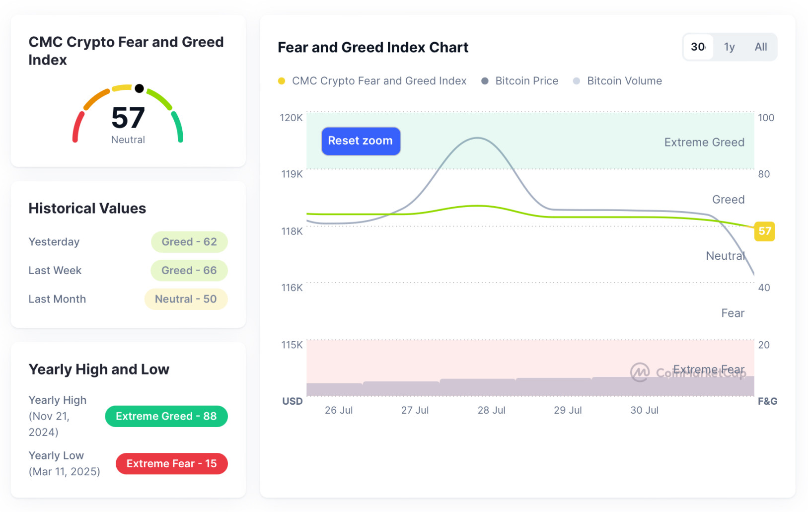 恐惧与贪婪指数(Fear & Greed Index)截至 8 月 1 日,恐惧与贪婪指数暂报 57,处于“贪婪(Greed)”区间下沿,较前期高点有所回落,反映出当前市场风险偏好虽仍存在,但已由此前的亢奋转向相对谨慎的状态,投资者在当前高位表现出更强的风险控制意识。