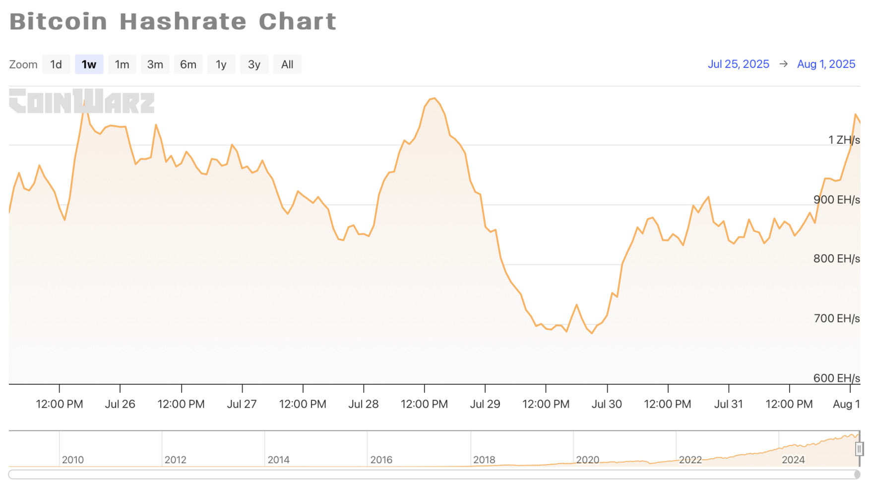 2025 年 7 月 26 日至 8 月 1 日,比特币网络哈希率整体表现出较强波动性。26 日至 27 日,哈希率持续下行,反映出部分矿工受电价、气候或维护等因素影响,临时停机或削减算力。28 日至 29 日,哈希率剧烈震荡,经历快速拉升与深度回撤,波动区间近 400 EH/s,网络稳定性受到显著扰动。30 日至 8 月 1 日,哈希率进入阶段性修复通道,逐步恢复至 1 ZH/s 水平,显示部分矿工重新上线,网络活跃度回升。