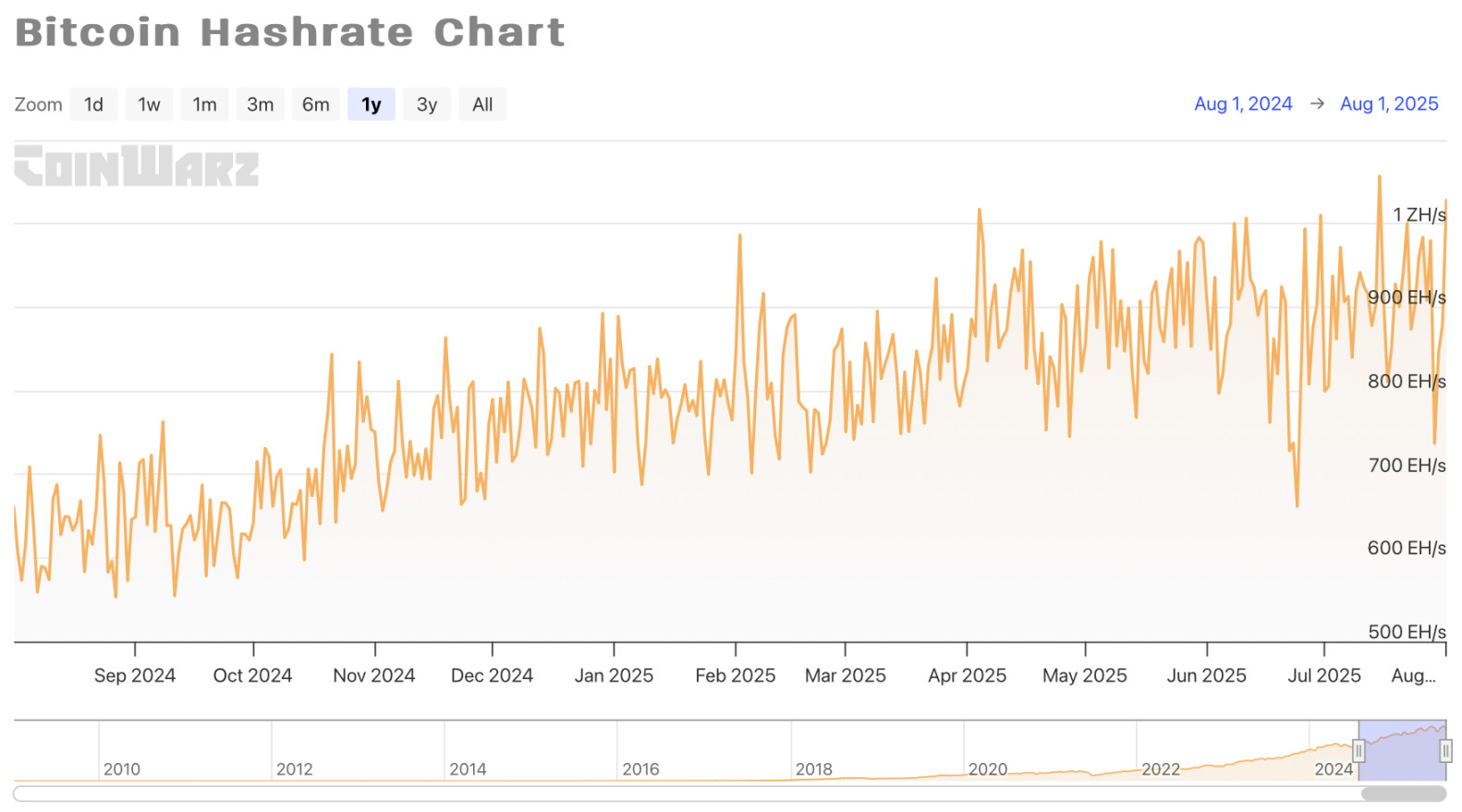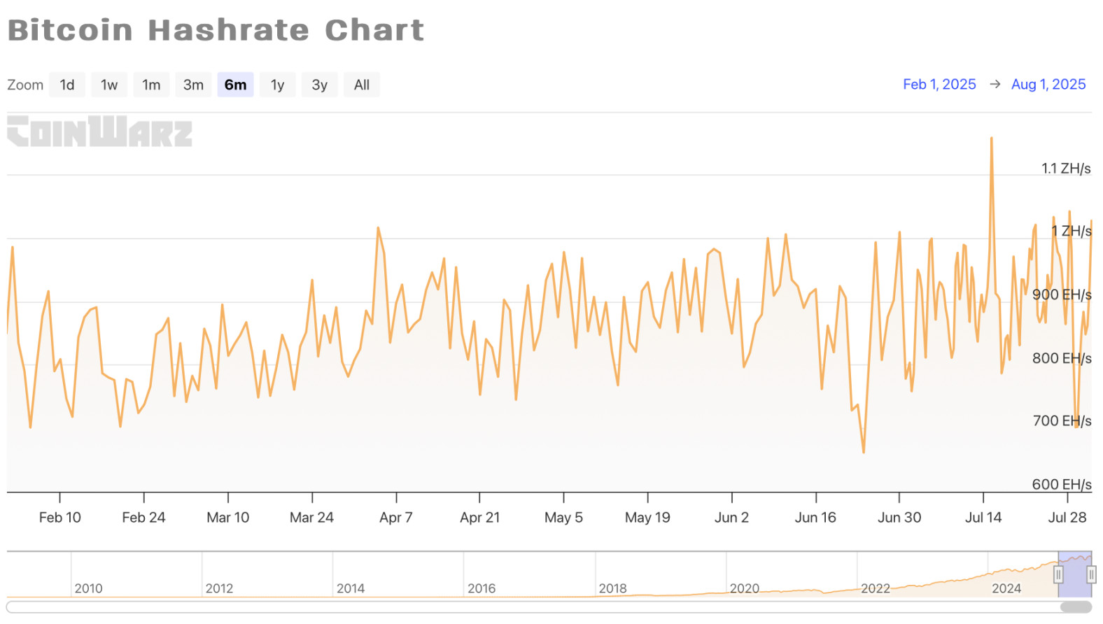 从过去六个月的数据来看,比特币网络哈希率整体呈现稳步上升态势。尽管短期内偶有剧烈波动,但整体趋势反映出矿工对比特币网络长期前景的看好以及高效矿机持续部署带来的算力支撑。自 2025 年初以来,哈希率由 700–800 EH/s 区间持续提升,目前稳定在 800–1000 EH/s 水平,阶段性甚至突破 1 ZH/s,显示出新一轮算力扩张周期的成型。