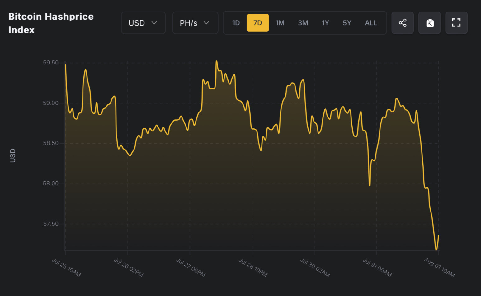 从单位算力每日收益(Hashprice)的角度观察,根据 Hashrate Index 的数据,截至 8 月 1 日,Hashprice 报 57.41 美元 /PH/s/ 天,较上周同期略有回落,反映出矿工单位算力收益面临一定压缩压力。7 月 31 日,Hashprice 降至周内低点 57.97 美元,而 8 月 1 日则出现继续降低,从日内高点 58.90 美元下跌至 57.17 美元,显示出短期内市场对于比特币价格下行、交易手续费减少及全网算力波动等多重因素反应较为敏感。