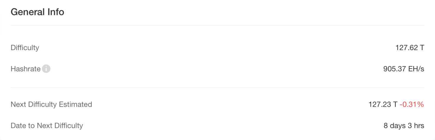 根据 CloverPool 的数据显示,截至 2025 年 8 月 1 日,比特币全网算力已升至 905.37 EH/s,挖矿难度为 127.62 T。预计 8 月 8 日将进行下一轮难度调整,下调幅度约为 0.31%,届时难度预计降至 127.23 T。这反映出网络近期的算力波动正触发协议的适应性调节机制。整体来看,全网算力仍处于历史高位区间,说明主流矿商在高效运营背景下维持了较强的出块能力。