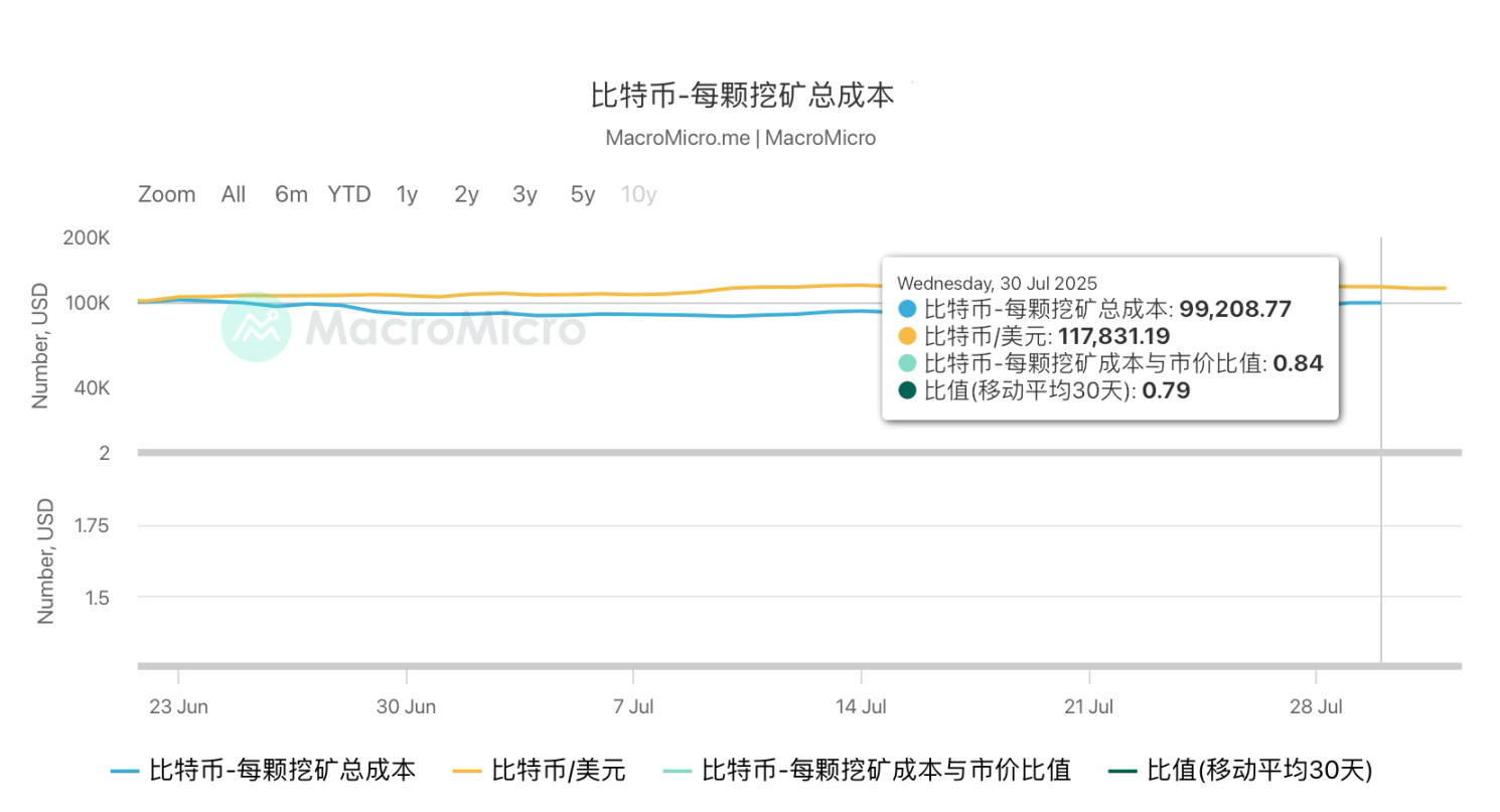 从挖矿成本角度来看,根据 MacroMicro 最新模型测算,截至 2025 年 7 月 30 日,比特币的单位生产成本约为 99,208.77 美元,而同期现货价格为 117,831.19 美元,挖矿成本 - 现价比(Mining Cost-to-Price Ratio)为 0.79,意味着矿工平均仍有约 20% 的毛利空间。对比 7 月 26 日数据,单位成本为 93,178.64 美元,现货价 117,947.37 美元,对应成本比为 0.80;截至 8 月 1 日,成本比依然维持在 0.79 水平。整体来看,挖矿利润率在过去一周保持稳定,整体盈利水平仍较可观。