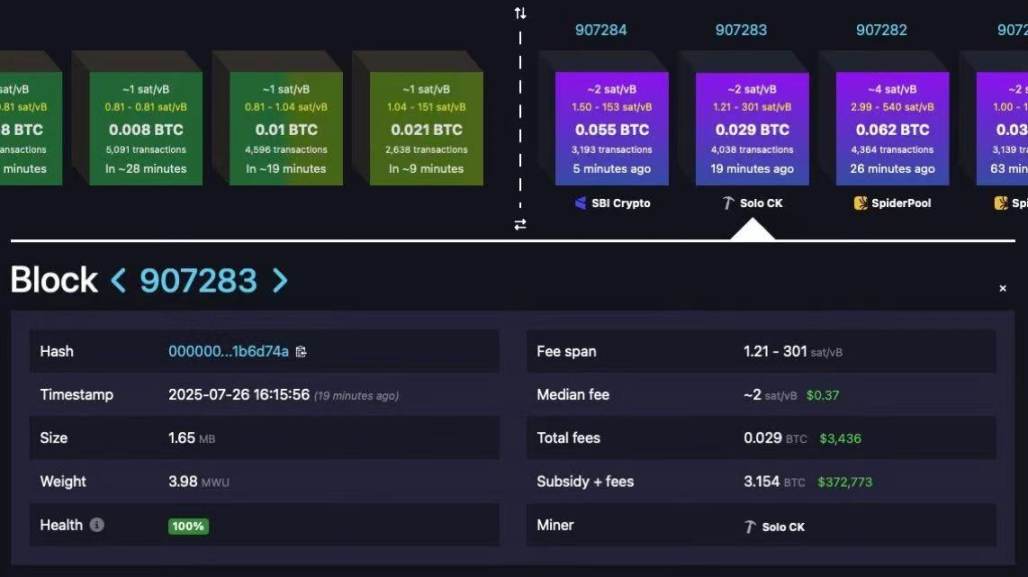 7 月 27 日,据 Cointelegraph 披露,一位独立矿工成功挖出了比特币区块 907283,获得了 3.154 枚 BTC 的奖励,价值约 37.2 万美元。