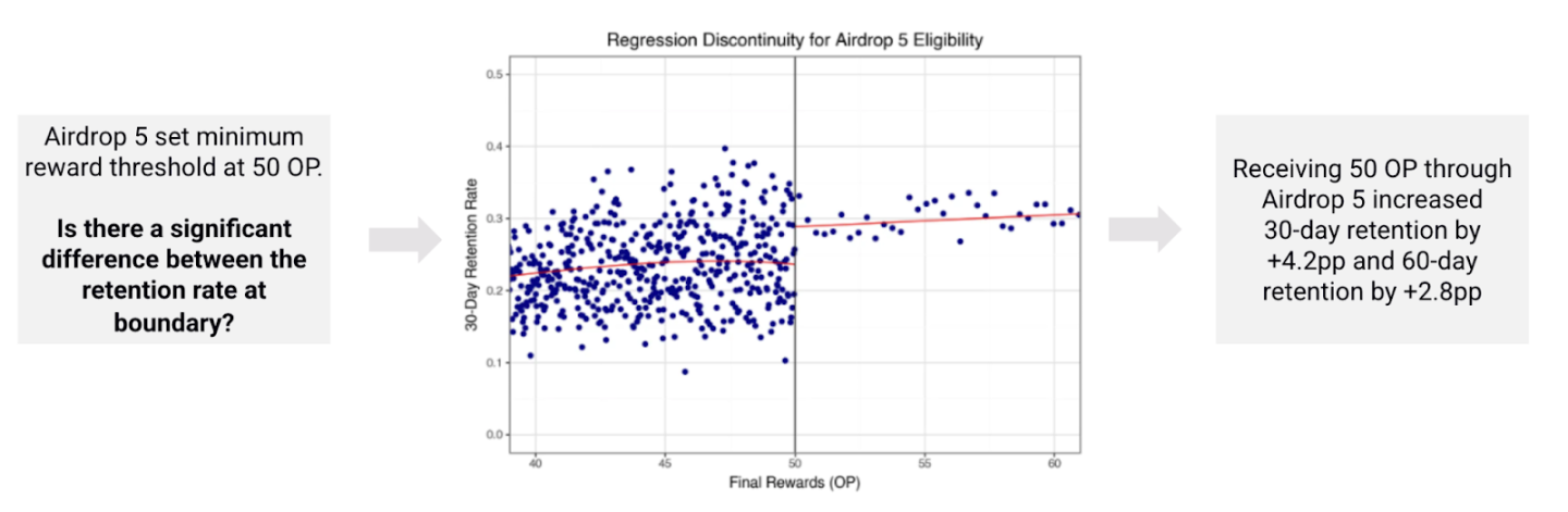 为解决混淆问题并评估空投 5 对用户留存的影响,我们使用回归不连续性设计,研究 50 OP 阈值附近的干预效果,比较刚好达到或未达到阈值的地址。结果显示,空投使 30 天留存率增加 4.2 个百分点,60 天留存率增加 2.8 个百分点。