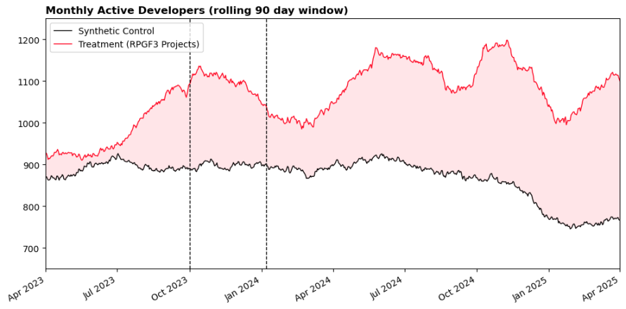 开源观察家 (OSO) 使用合成控制来估算如果没有获得资金,那些获得奖励的项目会发生什么?通过构建来自同类生态系统的类似项目的加权组合,我们可以使用反事实模型来比较实际结果,从而在缺乏随机性的情况下,提供对项目有效性的解读。