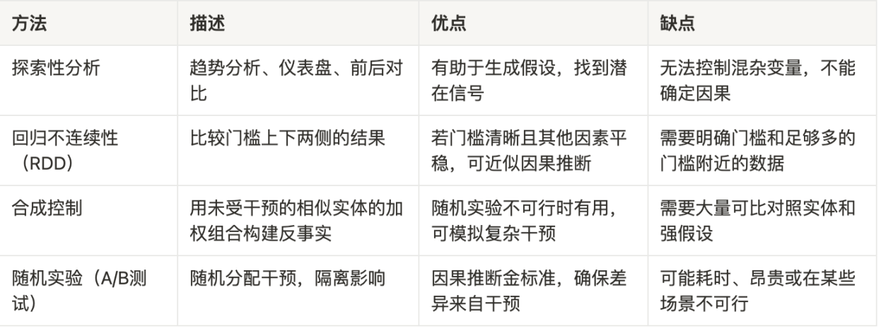 因果推理方法有很多,每种方法都适用于不同的数据和决策环境。为了帮助您确定使用哪种方法,下表(虽并非详尽)基于两个因素概述了不同的分析方法: