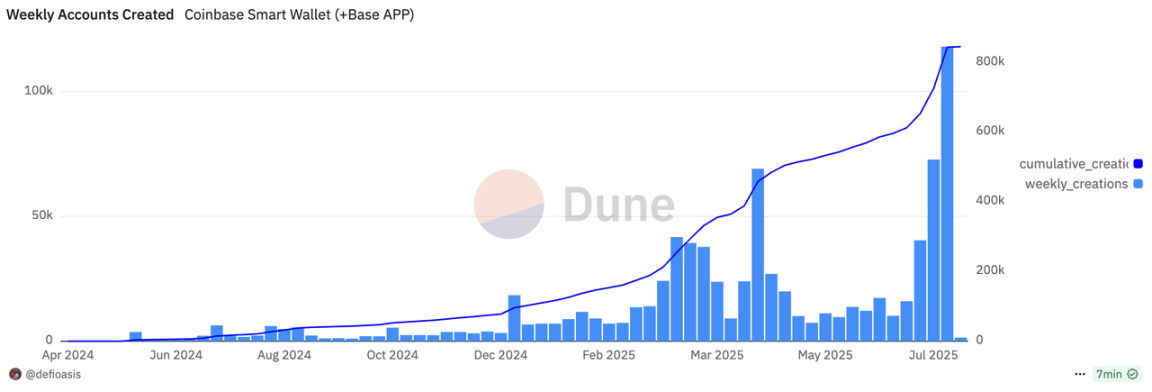 USDC 是 Base APP 中的通用货币,可以在 Base APP 中任何一切中使用。用户无需在交易中去切换网络或者支付 Gas 费用,这背后的一切都由 Coinbase Smart Wallet 代为执行;用户在界面的体验是无感的,甚至不知道自己完成了一项链上操作。同时,作为背靠美国最大交易所 Coinbase 的应用,Base APP 承担起了 Base 网络生态应用最为直接的分发渠道。目前 Coinbase Smart Wallet 部署数量超过 84 万,在过去两周新部署数量接连创下历史新高,其中在 7 月 28 日至 8 月 3 日单周新增 11.8 个新帐户。由于 Base APP 仍处于邀请制,预计还有数十万甚至上百万的用户仍在排队等待邀请码中。